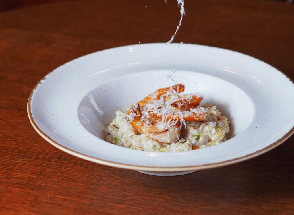 Season shrimp with the same spices, then sauté in 3 tbsp hot margarine for 3–4 minutes per side. Plate risotto, top with shrimp, and serve with Brussels sprouts.