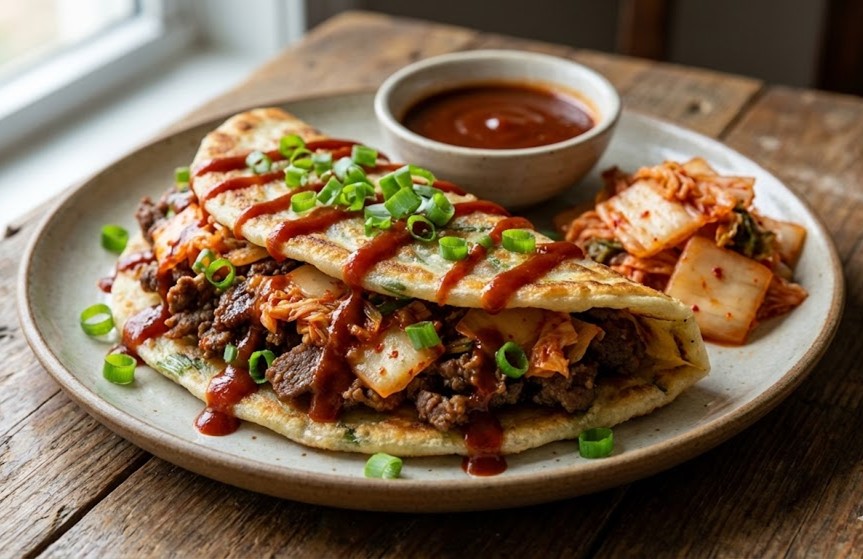 Heat pancakes, fill with bulgogi mix, and top with sauce and green onions.