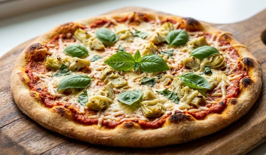 Brush crust with oil, spread red pepper mix, add artichokes and cheese.
