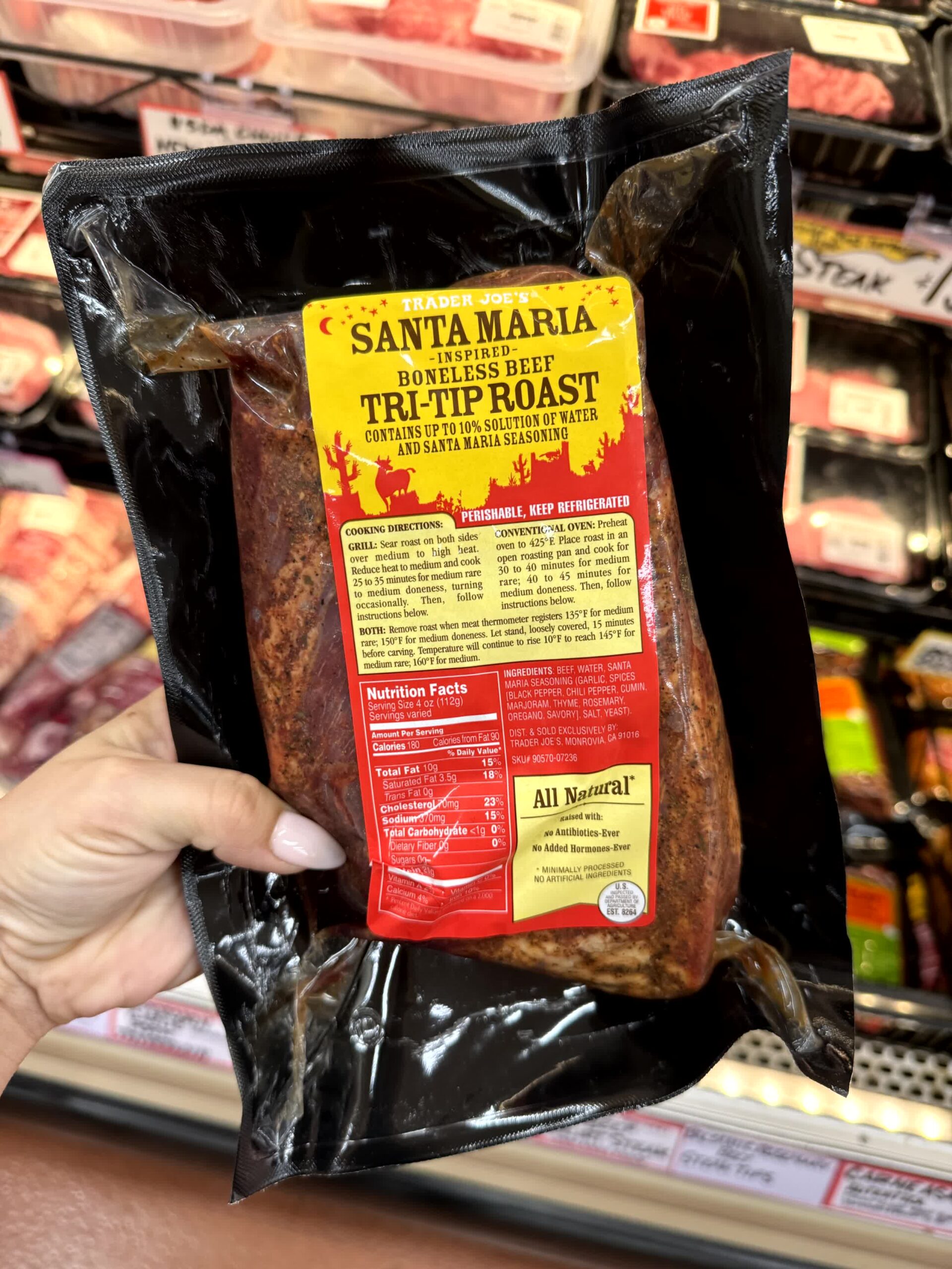 Taste Test Notes: A flavorful tri-tip with a minimal yet effective marinade of garlic, pepper, cumin, rosemary, thyme, oregano, and salt. It cooks to a perfect medium-rare with a crispy exterior, ideal for standalone meals.