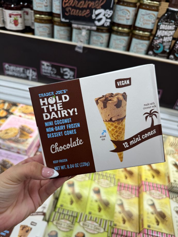 Trader Joe’s Hold the Dairy! Mini Coconut Non-Dairy Frozen Dessert Cones in Chocolate flavor are a delightful treat for anyone seeking a dairy-free indulgence. Made with creamy coconut milk, these mini cones are perfect for vegans and those with lactose intolerance, providing all the enjoyment of a traditional ice cream cone without the dairy.