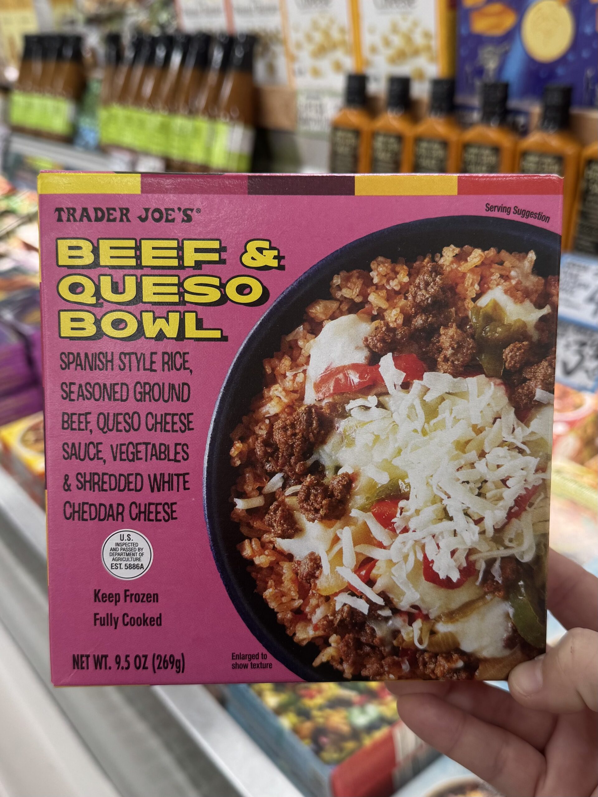 Description: A frozen meal featuring Spanish-style rice, seasoned beef, peppers, and real queso sauce.